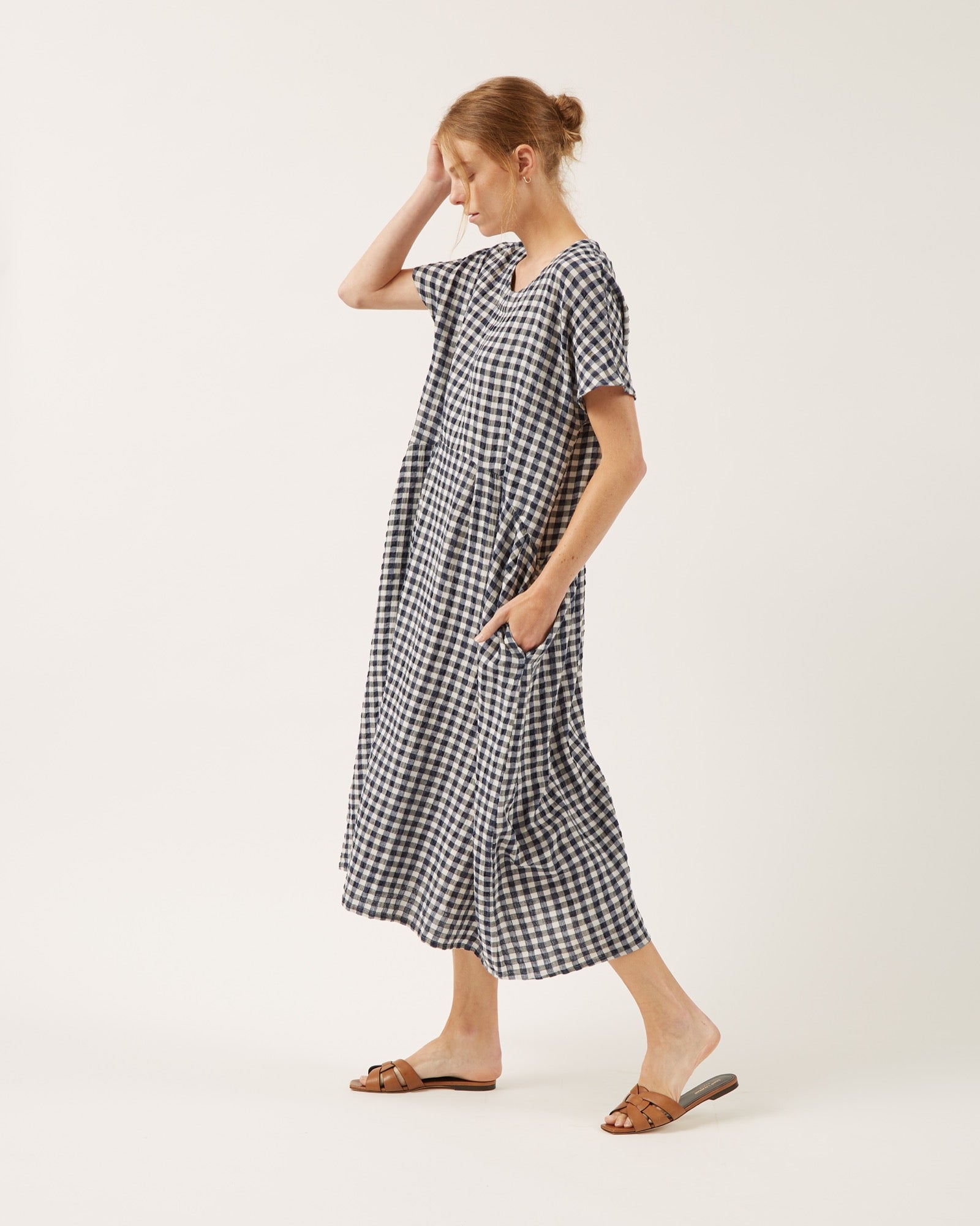 Model wears size S, motif: Gingham seersucker Linen / Navy (1 cm).